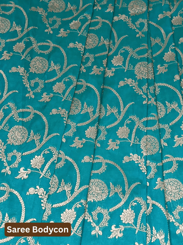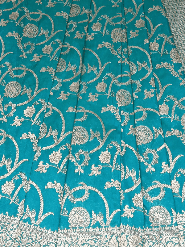 👉 Absolutely! Its regal turquoise silk and silver zari floral jaal make it perfect for weddings and receptions.