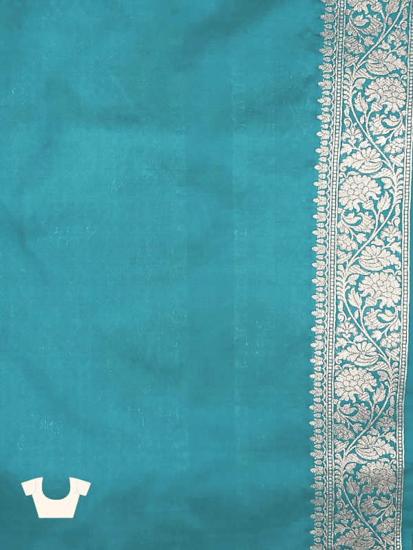 This Firozi Banarasi Silk Saree is a masterpiece of traditional craftsmanship blended with timeless elegance. Handwoven with precision, the saree features an all-over gold zari floral jaal design, symbolizing grace and prosperity. The delicate vines and floral motifs flow seamlessly across the fabric, making it a regal choice for any grand celebration.