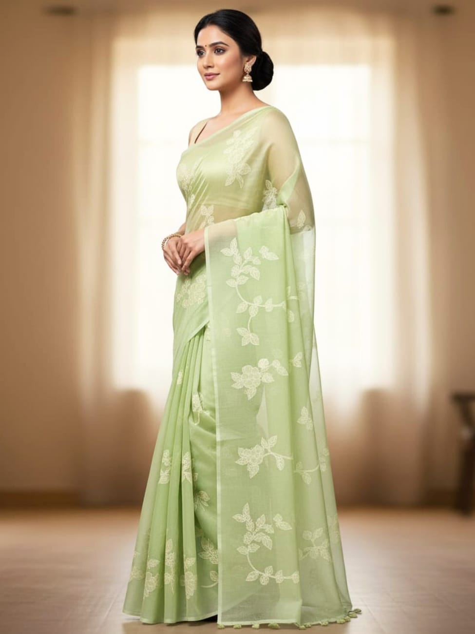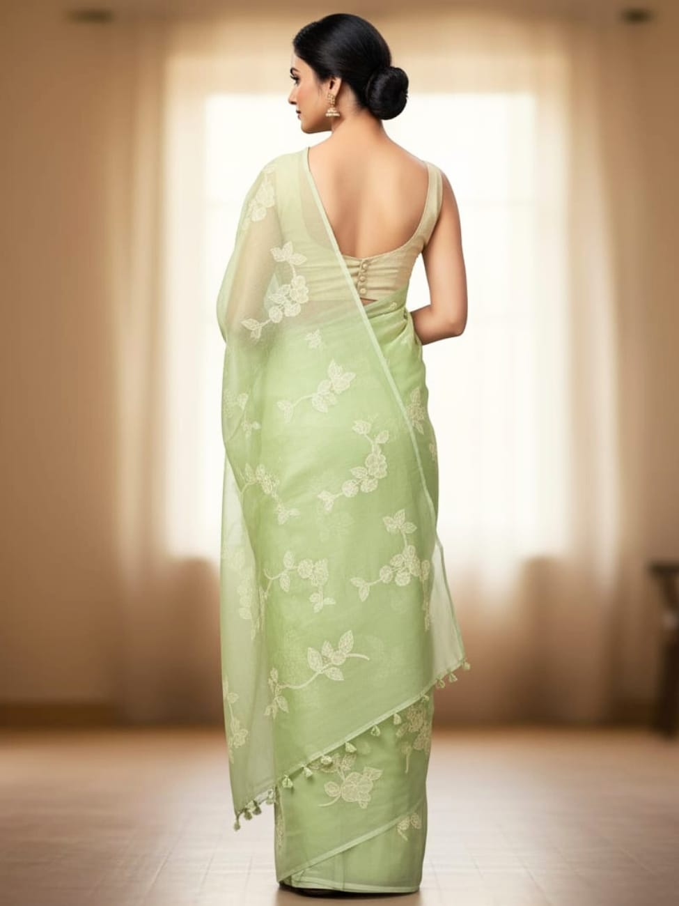 Step into elegance with this gorgeous light green Organza Kora Silk saree, beautifully adorned with delicate white floral embroidery. Crafted by skilled artisans, this saree combines traditional Banarasi style with modern sophistication. The lightweight, sheer fabric ensures comfort and grace for festive occasions, parties, or weddings.
